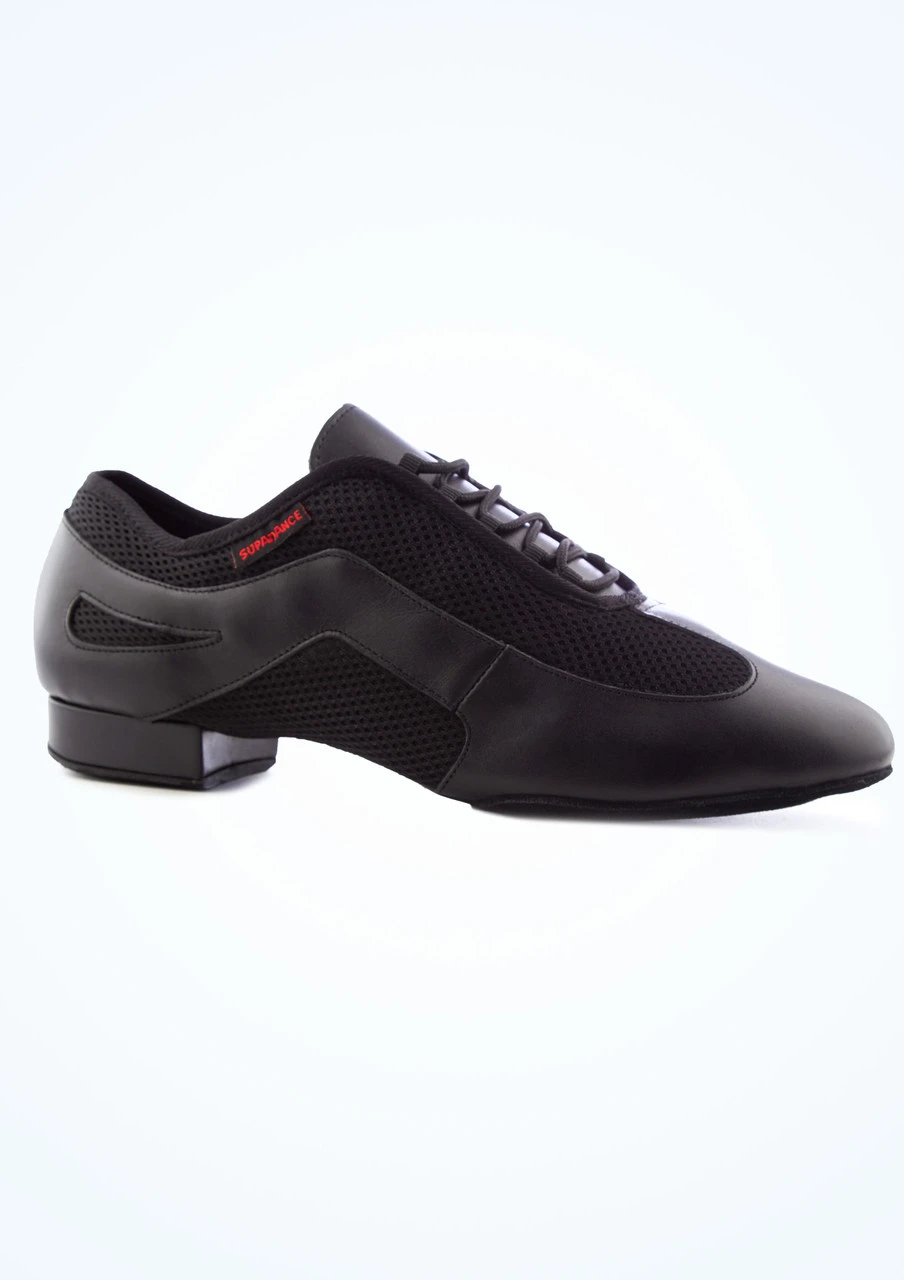 A stylish new design from Supadance. Black leather and mesh detailing creates a stylish look. Low curved heel perfect for ballroom practice and teaching. The curved heel is a new design feature where the heel curves up at the back and is cushioned in the centre, in order to help with heel leads.