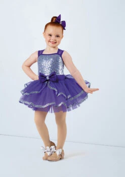 Pull-on tricot tutu with sequin trim top skirt and jeweled bow