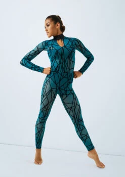 Make a bold statement in this fun geometric unitard with a flattering back cut out. The unitard has an attached bodice and briefs and lined bra and crotch so you can dance in comfort and confidence. The V neck cut out is flattering and the black neckline contrasts with the mesh geometric print.