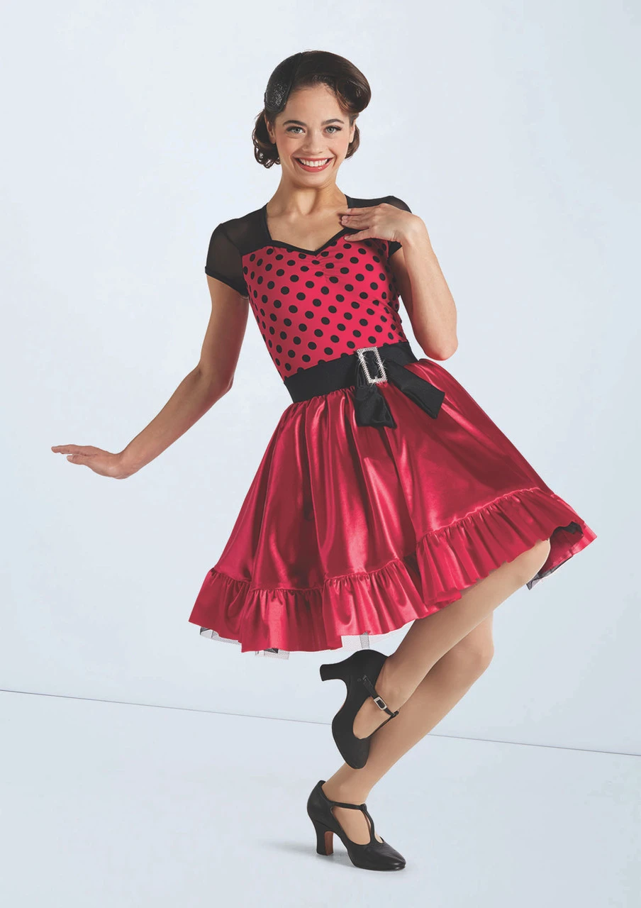 Dress features a polka dot spandex bodice