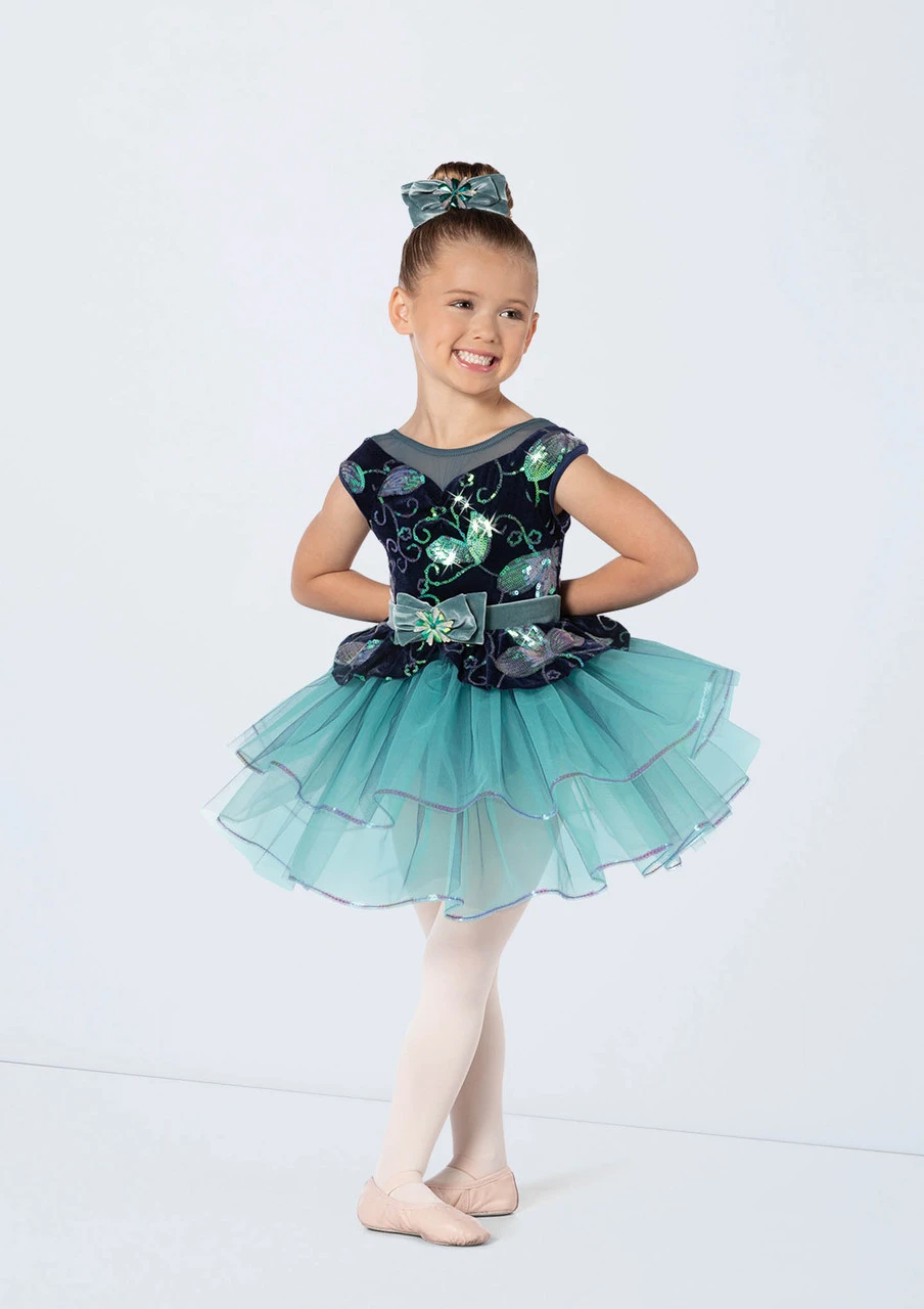 -Tutu is layered tulle and tricot with iridescent sequin trim
