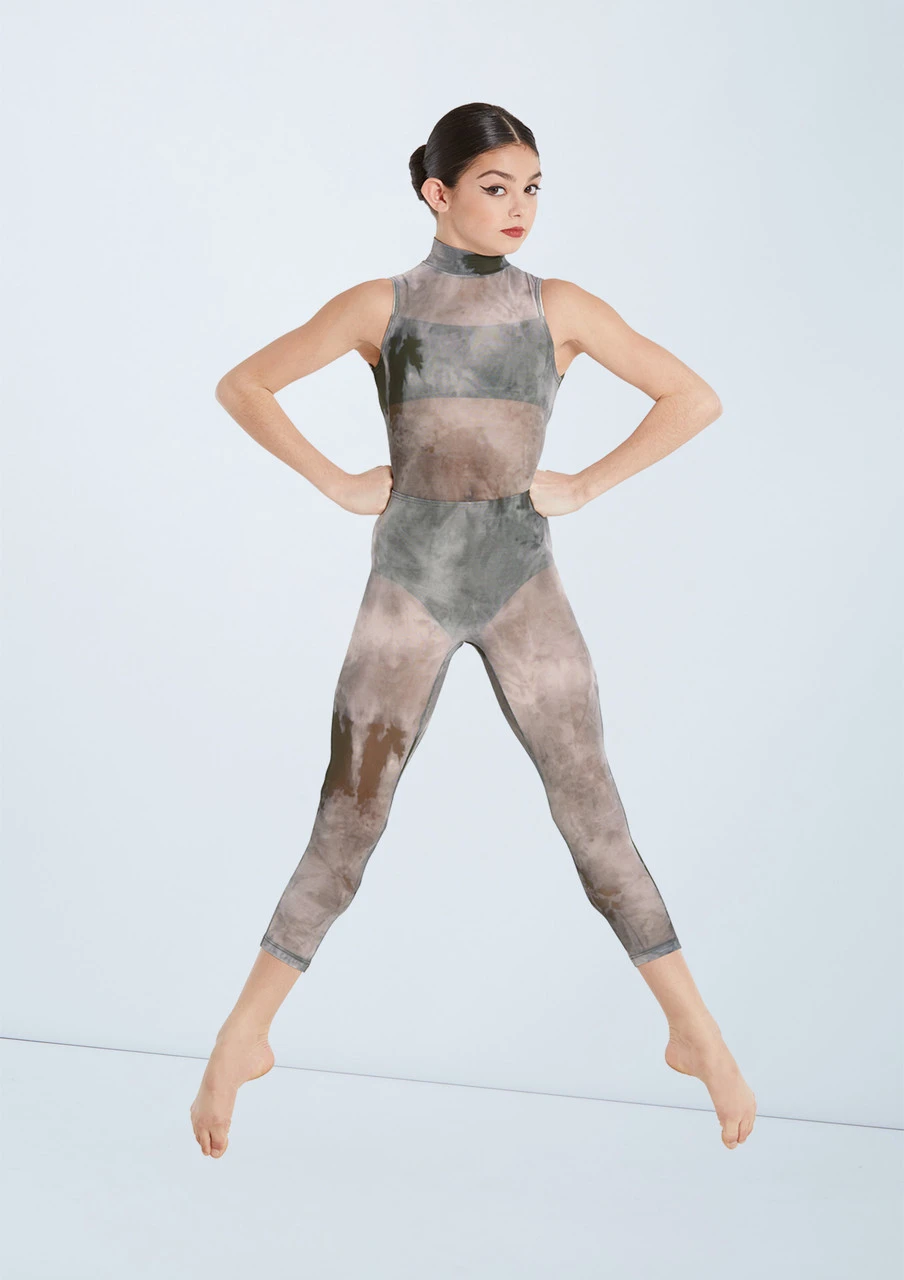Create a fierce look with this smoky mesh unitard with flattering crisscross straps on the back. The unitard has a built-in bandeau and briefs set which disguises the shelf bra and crotch lining so you can dance with confidence. The slightly short leg length adds to the modern look.